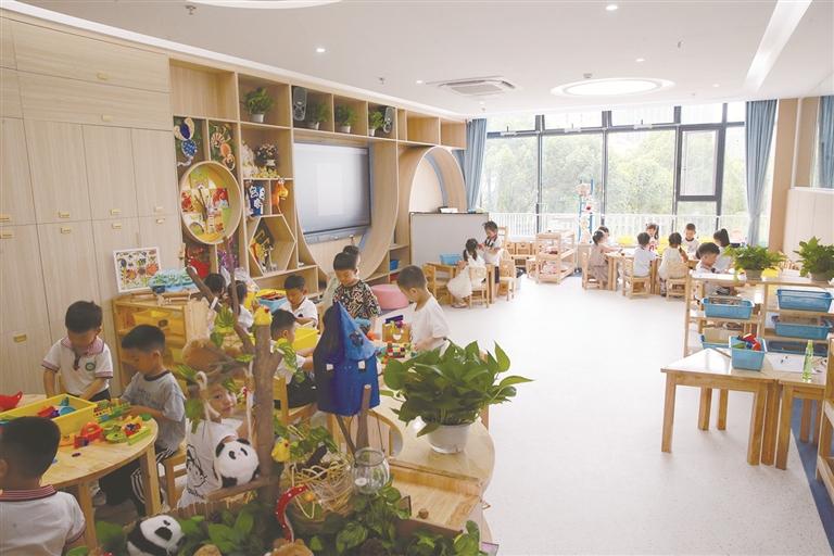 在信州区行政中心附近,一座以“森林童话”为主题的保育院成为家长热议的“网红园”。这所公办幼儿园于2023年春季开园,设有15个班级。园内的原木色攀爬架、沙水游戏区、绘本图书馆等设施充满童趣,孩子们在老师带领下观察蚂蚁搬家、体验陶艺制作,笑声回荡在每个角落。“这里没有‘填鸭式’教学,只有探索和游戏的快乐。”家长饶先生说。为缓解家长接送难题,园区还推出“延时服务”,提供艺术启蒙、绘本阅读等课后课程,获评“江西省标准化幼儿园”。